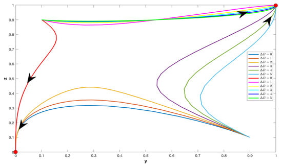 Phase diagrams of Cases VI and IX with different . Here, the initial points are and . A red point represents an ESS state and the arrow indicates the direction of evolution.