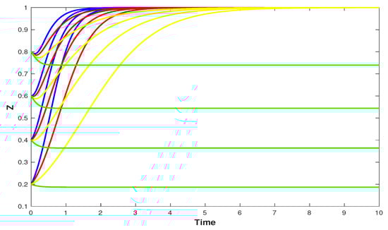 The dynamic evolution of the number of customers as a result of changes in . Here, changes from 9 to 12. The initial points are , , and . The blue, red, yellow and green curves corresponds to , , and , respectively.