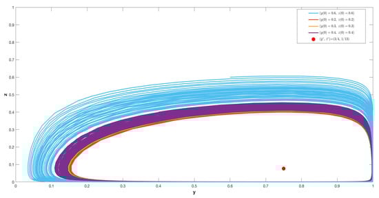The interaction between farmers and customers involves further complexity, however. When , , , , , and , as shown in Figure 6, the compromise state might be a center, which implies that the preferences of farmers and consumers for an organic (or conventional) strategy change periodically.
