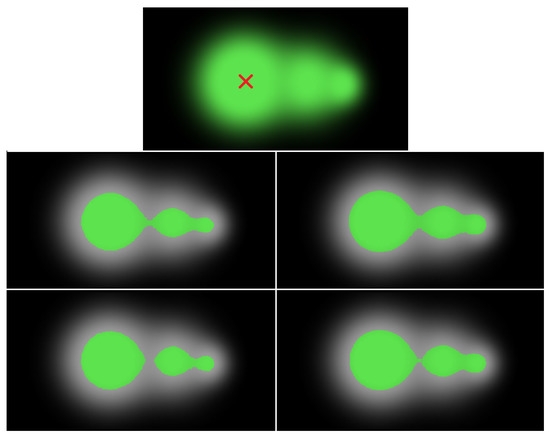 Image “green object”, where we preserve only the color of pixels in a particular -cut where we set . From the left, top row: original image where the red cross marks the selected color k. Middle row: and of the -fuzzy rough set. Bottom row: and of the -fuzzy rough set.