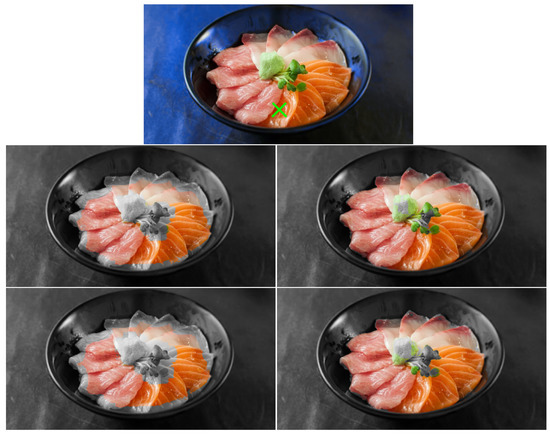 Image “meal”, where we preserve only the color of pixels in a particular -cut where we set . From left, top row: original image where the green cross marks the selected color k. Middle row: and of the -fuzzy rough set. Bottom row: and of the -fuzzy rough set.