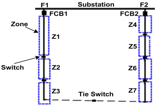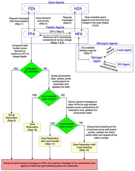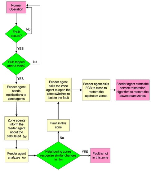The FZAs are the agents of the zones which lost power due to fault occurrence, while the HZAs are the agents of the zones in the backup healthy feeder along the restoration path. For example, in Figure 1, for a fault in Z1, the FZAs are Z1, Z2, and Z3, while the HZAs can be Z4, Z5, Z6, and Z7. Before fault occurrence, all agents have the same nature, as they monitor the readings of the measuring devices located at their zones’ boundary switches. However, when a fault occurs, each agent is capable of identifying the problem and starts performing its role, as will be explained in detail in Section 4.