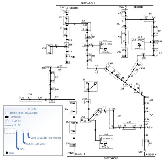 In the proposed MAS, the hierarchical distributed MAS framework is used in which each distribution feeder is divided into a number of zones based on the location of protection devices. As shown in Figure 1, each considered zone is a section bounded by two or more switches without any switch included inside it. The boundaries between neighboring feeders would be tie switches that would aid in the restoration process during a fault. Regarding the applied agents, there are two main sets: the first set of distribution feeder agents is responsible for fault locating and service restoration, while the second set of micro-grid agents assists in the restoration process as well as in maintaining energy balance and controlling DG penetration into the micro-grid.