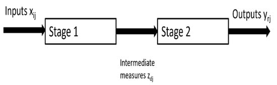 Moreover, researchers understood that the robustness of a DEA model increases if the DMU under study is not considered a “black box”, and for that reason, the intermediate steps of the typical DEA model were increased []. The addition of intermediate stages was considered a more accurate depiction of certain complex processes, and it allowed researchers to better track sources of inefficiencies []; thus, network DEA models can capture the weights for the calculation of efficiency in a more appropriate manner. Furthermore, the inclusion of those intermediate steps could free the analysis from the limitation of how many inputs and outputs could be used [] and could better reflect the inner workings of complex processes. For that reason, two-stage (or network) DEA models have been increasingly used for sustainability assessments of different types of DMUs []. A typical two-stage DEA model is presented in Figure 1 below: