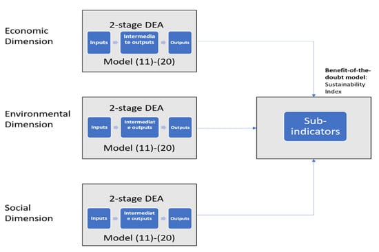 However, for a more inclusive calculation of sustainability that is not limited by the number of inputs and outputs that can be used, the proposed alternative, two-stage model that was described by Equations (11)–(20) can be incorporated in the framework proposed by Tsaples and Papathanasiou [] and shown in Figure 2.