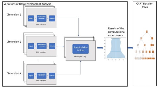 The purpose of the current paper is to address the above gaps by proposing a computational framework with a twofold functionality. First, it uses a two-stage Data Envelopment Analysis model with an alternative optimization metric that attempts to intervene in the weights of the inputs, intermediate measures and outputs to better reflect their importance for the DMUs. Second, the framework accompanies the DEA model with a computational stage that will attempt to incorporate different perceptions (meaning different combinations of inputs and outputs) and apply it in the measurement of sustainability of the EU 28 countries using machine learning techniques. To achieve this objective, the framework will rely on Exploratory Modeling and Analysis (EMA). EMA is a school of thought developed at RAND corporation [] and promotes the exploratory use of quantitative methods despite methodological limitations, uncertainties and different perceptions. Employing an exploratory approach to sustainability measurement could reveal unanticipated implications of the initial assumptions regarding inputs and outputs. The use of computational experimentations to explore conjectures, models and datasets is not new. It has been applied in simulation models []), mathematics [] and of course in various disciplines with the emergence of big data []. The approach requires computational power, development of new algorithms and techniques to analyze the data that will be generated.