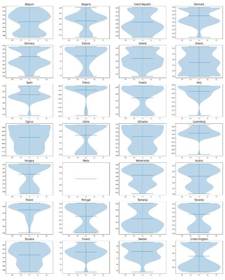 The data source is Eurostat (https://ec.europa.eu/eurostat (accessed on 10 January 2021)) for the year 2018, which was the latest common year for which data were available for all countries during the writing of the current paper. The choice of the specific parameters was based on the works of Tsaples and Papathanasiou [,]. However, as the authors note in their literature review [], despite the commonalities, the works in the literature use different sets of inputs and outputs to measure sustainability. For example, the input Population can be found in papers such as the one by Lo Storto [], while the pollution outputs can be found in several papers, such as the one by Li et al. []. Nonetheless, as it was stated in the Introduction, the objective of the current paper is to propose a computational framework that will incorporate all those different perceptions (hence different combinations of parameters) into a single measure of sustainability.