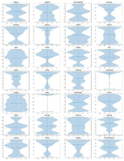 Another contribution of the current paper is the calculation of the environmental performance of European countries with the two-stage DEA model described by Equations (11)–(20). For the determination of the inputs, intermediate measures and outputs, the efforts of Tsaples and Papathanasiou [] were used. The authors study the concept of sustainability and how DEA has tackled it and consider environmental performance as one of the dimensions of sustainability. Furthermore, Tsaples and Papathanasiou [] use different combinations of inputs, intermediate measures and outputs to calculate the environmental performance of EU countries.