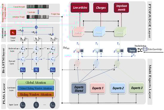 The causal inference and multi-expert FTOPJUDGE judgment prediction model was mainly composed of two parts: the causal inference model and the text-processing model. These two parts were carried out at the same time and fused at the final loss calculation. The text-processing model consisted of the pre-trained language model Lawformer, the text-encoding model BiLSTM-Att, and the multi-expert FTOPJUDGE classifier, which were partially composed. The overall model framework is shown in Figure 1.