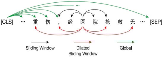 Dilated Sliding Window Attention: In order to further increase the field of view without increasing the amount of computation, the sliding window could be “expanded”, which was similar to the dilated convolution of CNN []. In this attention mechanism, each window was not continuous, but there was a gap between each participating token with length . Since we used a multi-head attention mechanism in each window, the gap lengths of different heads could be different at the same time, which would also enable the attention to obtain information at different levels of text and improve the performance of the model.