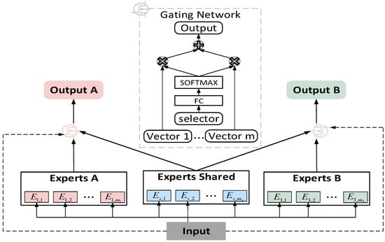 As shown in Figure 4, we set up an exclusive expert group for each task and a shared expert group to realize the information exchange between multiple tasks. Each expert group was composed of multiple expert networks. Dedicated expert groups were responsible for providing information for dedicated tasks, and shared expert groups were responsible for learning and sharing information to facilitate multi-tasking. In other words, the shared expert groups were affected by all tasks, while the exclusive expert groups were affected only by the tasks to which they belonged, and the two groups were selectively fused through a gating mechanism. Taking task k as an example, the input of the multi-expert mechanism is . The specific calculation process is as follows: