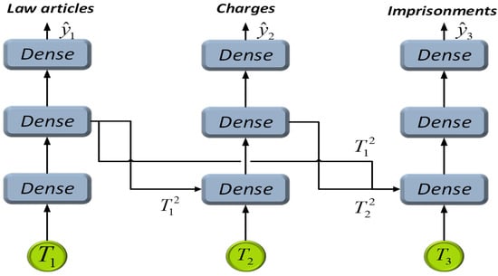 where is the output of layer in the three-layer fully connected network corresponding to task , is the input of task , and is the output of task . Taking the second task as an example, the input was concatenated by the vector and the input provided by the FTOPJUDGE classifier for the second task, . The calculation process of law prediction and sentence prediction is similar to that of crime prediction, with the difference being that only is required for the input of law prediction, while , and are required for the input of crime prediction. The different inputs of each task also realize the same topological order structure as TOPJUDGE. Finally, we obtained , , and , where are the number of label categories for the articles, charges, and imprisonments, respectively.