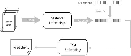 We injected the evaluated causal intensities into the text encoder BiLSTM-Att. The case fact description obtained sentence embedding with contextual information through BiLSTM. After that, the attention mechanism assigned different weights to each sentence and summed these sentences using the weights to construct the text embedding :