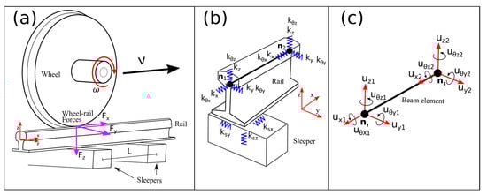 (a) an example of a wheel-rail interaction model; (b) the FEM model of the rail with stiffness; (c) a single 12-degree-of-freedom beam element.