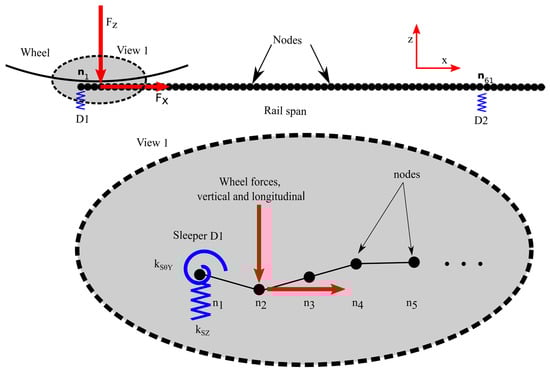 The finite element model of the rail is built on beam elements connected in a series and is supported by springs that simulate the sleeper stiffness, as illustrated in Figure 3. The hunting loads, pre-calculated with the commercial software Simpack, vary in time and position. As the wheel moves forward, it interacts with each of the nodes through the wheel-rail forces in three directions. The model contains 1020 beam elements connected through nodes n1, n2, n3 … n1021. The rail is mounted on 18 sleepers (sleeper D1, sleeper D2, … sleeper D18) with 60 elements between them. The number of elements between sleepers was chosen to be 60 to expand the contact patch size of the wheel and the rail (11 mm) to the beam element size [21]. A two-dimensional FEM representation of the first rail span is illustrated in Figure 3 on the x–z plane. The interaction forces are represented by the red arrows. The nodes in this rail span are n1, n2, n3 … n61, and and are the vertical and rotational stiffness of the sleepers, accordingly.