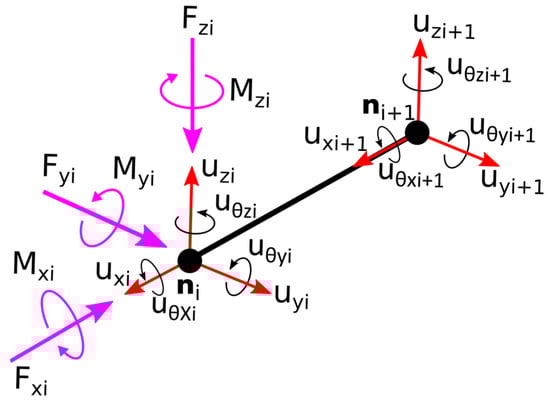 A single 3D beam element featuring the 12 degrees of freedom of the rail model. The forces , , and moments , , are the wheel forces applied to the node . At the next step, the forces , , and , and the moments , , and are applied to the node , and so on.