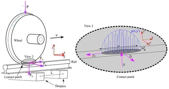 In this work, the wheel-rail interaction forces were pre-calculated using Simpack. These forces are applied to the rail during the simulation. Many authors [23,24,25,26] use Simpack to simulate rail vehicle dynamics and wheel-rail interaction forces. Simpack computes the forces that are developed on the contact patch using an elastic approach with spring/damper elements [27]. The contact is calculated using the Hertz method, see Figure 5. The semi-axes and of the equivalent contact ellipse are calculated using this theory.