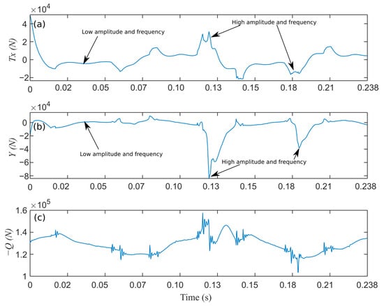 The computed input forces for the rail model by the Simpack software. (a) Longitudinal force , (b) Lateral force , (c) Vertical force .