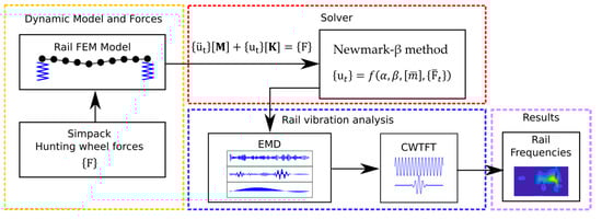 In general, once the FEM model is obtained and its dynamics are computed by the solver, the frequency information from the time response of the rail induced by the wheel forces can be obtained and analyzed. The flowchart is shown in Figure 9, whereas the stages for Dynamic Models and Solver have been described in previous sections of this paper.