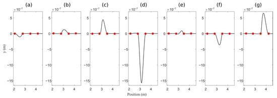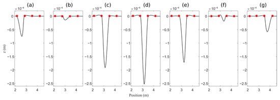 Evolution of the deflection of the rail in the vertical direction caused by the passage of the wheel. The red dots are the sleepers D4 to D7. (a) Passage between sleepers D4 and D5, (b–f) passage between sleepers D5 and D6 and (g) passage between sleepers D6 and D7.