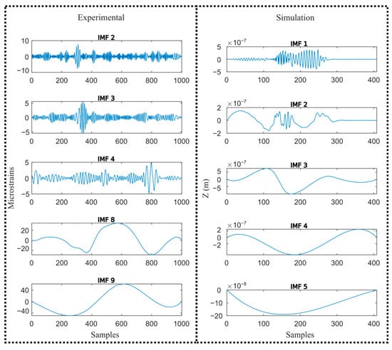 The EMD algorithm obtains the oscillating components of a signal, called intrinsic mode functions (IMF), by finding the local extrema in the test data. Every IMF contains signal information that is often difficult to study if the full wave is taken. One characteristic of this method is that the summation of the IMFs returns to the original signal. Some of the IMF can be discarded to obtain a selected-feature signal. The EMD method is suitable for nonlinear and nonstationary processes [33] since the decomposition is based on the local characteristic of the data. The EMD was applied to the experimental and simulation response signals, illustrated in Figure 13, and their IMFs are shown in Figure 14.
