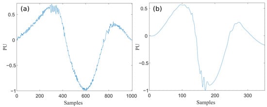 The IMF summation of the modes from Figure 14. (a) The resulting signal after summing the IMFs 1, 5, 6 and 7 of the experimental signal. (b) The resulting signal after summing the IMFs 1 to 5 of the simulation signal. The amplitude of both signals is normalized to observe the similarity. PU stands for per unit.