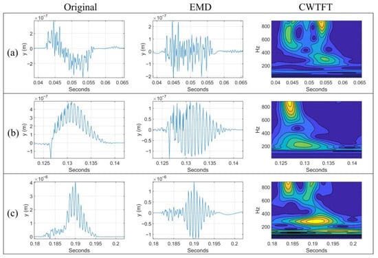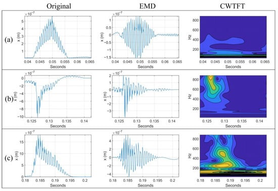 Figure 16 displays the time response and the frequency response of the nodes , , and , which correspond to the forces at times , , and , accordingly, in the longitudinal direction. The left charts are the original time response of the rail at the mentioned times. The charts in the middle are the IMF signals as a result of the applied EMD of those original responses. The right charts are the CWTFT spectrograms of the EMD signals presenting frequencies ranging from 0 to 820 Hz.