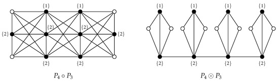 Figure 2. The labels of black-coloured vertices describe the (non-empty) weights of a -function and -function, respectively. - The corona product graph is the graph obtained from and , by taking one copy of and copies of and joining by an edge every vertex from the -copy of with the -vertex of . Figure 2 shows the graph .