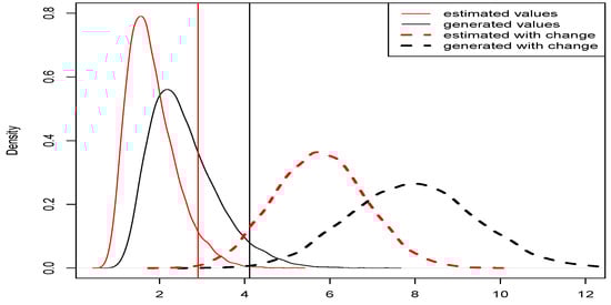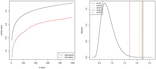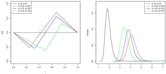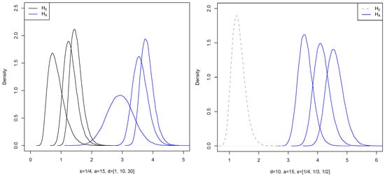 Since functional Principal Component Analysis (fPCA) represents a functional data sample in the most parsimonious way, we can see that the density of the test statistics in scenario (S2) is more on the left side and more concise. Critical values with of the statistics and were also calculated and are shown in Figure 5.