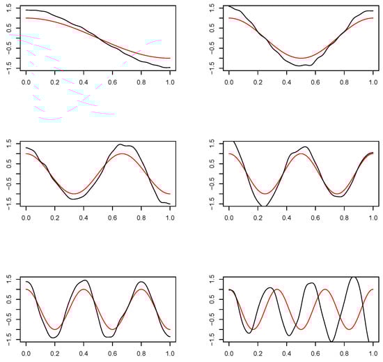 True basis functions (red) and “reconstructed” basis functions (black) using fPCA method.