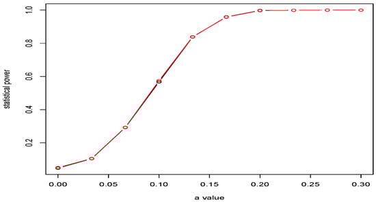 First, we compared the statistical power of the test (20) with statistic of the scenario (S1) and scenario (S2) with statistic . To this aim, we used sample defined in (38), where , which is in the middle of the sample. We started with the no drift (corresponding to the null hypothesis) and increasing the drift amount a by up to the point when . At each a value, we repeated the simulation 1000 times. This gives a good indication of the statistical power with the amount of the added drift. The statistical power is illustrated in Figure 6. Based on the simulation results, we can see that, even if the random functional sample is approximated from the discrete data points, it still holds the same statistical power and the performance does not suffer from the information loss due to smoothing and fPCA. These are important results, because, normally, in observed real-world data, the true functions are unknown and have to be approximated, which almost always introduces measurement errors.