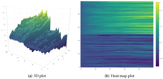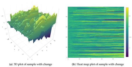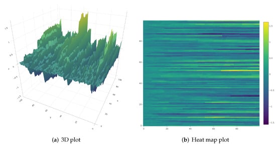 Next, we focus on the power tests (36) and (32) used directly on the functional data sets simulated in scenario (S3). Figure 7 and Figure 8 present the clear opposites of the functional data sets with respect to the change-point. The changes can be easily observed. However, especially working with functional data sets, the changes may not be that obvious. As an example, Figure 9 illustrates another functional data set with the change-point, where the presence of the change-point is not visible, but Monte Carlo experiments show that, with the same magnitude of change, for almost 80% of the cases, was correctly rejected.