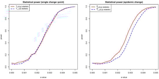 In the power studies, we tested two variants of the random functional samples, one with a single change-point in the middle of the functional sample and the second with the two change-points forming epidemic change. In the first case, the functional sample is constructed from random functions where 500 curves are changed in order to violate the null hypothesis. The model that violates the null hypothesis is defined as , , and the parameter a is used to control the magnitude of the drift after the change-point. In the second case, during each iteration, random functions are generated, where 500 curves in the middle were modified by taking . During each repetition, twostatistics are calculated: (35) and (26) in the single change-point simulation. For the epidemic change simulation (31), statistic is calculated. We set the p-variation p parameter to 3. We also tested with different p-values, but this did not have any impact on the overall performance.