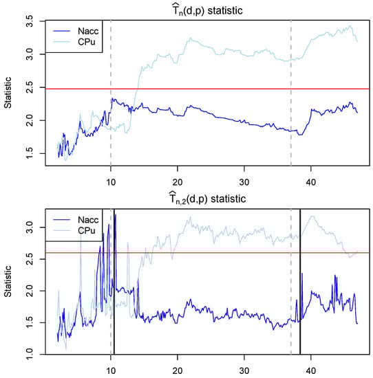 Statistics of the first alcohol drinking event, which lasted about 27 s. Ten seconds before and 10 s after were also included. The red horizontal line indicates the critical value with 0.95. Vertical gray dashed lines mark the beginning and the end of the drinking time. The black solid vertical lines mark the locations of the change-points detected using the restricted p-variation method. Blue and light blue colors represent different brain regions.