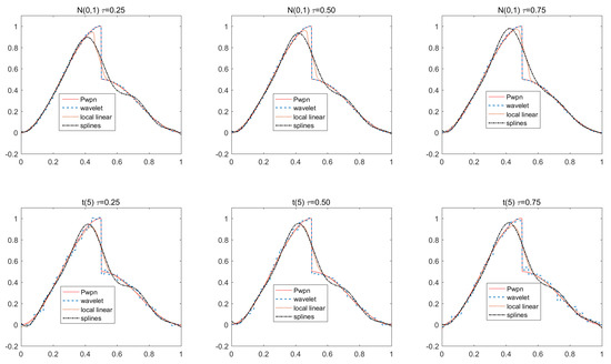 where is a sequence of regular grid points. These results of MSE for are listed in Table 1 for Case I (Pwpn) and Table 2 for Case II (Blocks). The actual functions and their estimated curves for the two cases are depicted in Figure 1 and Figure 2 when , and , 0.5 and 0.75, respectively.