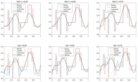 The true time-varying coefficient function Blocks and their QR-wavelet, QR-local-linear and QR-splines estimates when , and , 0.50 and 0.75 for the errors and .