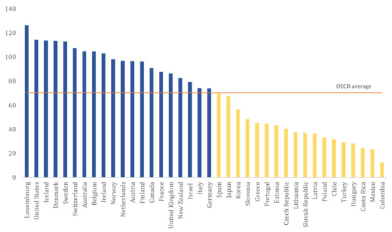 Figure 1 presents the estimates of labour productivity for each country, with blue bars denoting higher than OECD-average productivity levels, yellow bars lower than average productivity and the orange line the OECD-average. The top five counties in terms of labour productivity are Luxembourg, the United States, Iceland, Denmark and Sweden, while the bottom five are Turkey, Hungary, Costa Rica, Mexico and Colombia. The OECD-average of labour productivity is about 70.4, while all the countries with labour productivity above average are European, plus Australia, New Zealand and the US.
