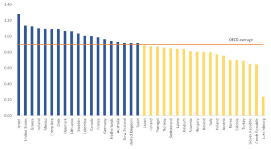 Greece stands out as such an example. The country registers the third highest capital productivity among the OECD countries (see Figure 2). This supposedly translates into a strong and sustainable Greek economy. Yet, in the past decade, Greece has become known for the deep recession it experienced, which has been the most intense among OECD countries since 1945. In advance, there is a large gap between labour and capital productivity. As depicted in Figure 1, Greece has a below OECD-average labour productivity. Applying an intersectoral analysis, this could be attributed to the large dependence of the Greek economy on imports and on the importance of the services sector, in conjunction with meager activity in the secondary sector (for alternative explanations on this issue, see [40,41,42,43,44]). At the same time, the shallow industrial structure of the Greek economy was further weakened on the run up to euro (see [45]). Thereby, other factors are likely critical in examining economic efficiency vis-à-vis the higher standards of living.