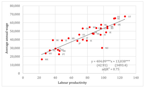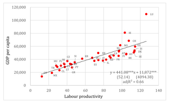 In what follows, we apply simple linear OLS regressions in order to assess, on the one hand, the relationship between productivity and the GDP per capita and, on the other, productivity and the annual average wages expressed in equivalent purchasing power standards. It should be noted that there are no OECD available data for the GDP per head of population for Costa Rica as well for wages for Chile, Colombia, Iceland, Latvia, Lithuania, New Zealand and Turkey. The data for GDP per head of population and average annual wages are available from https://stats.oecd.org/Index.aspx?DataSet (accessed on 26 February 2022).