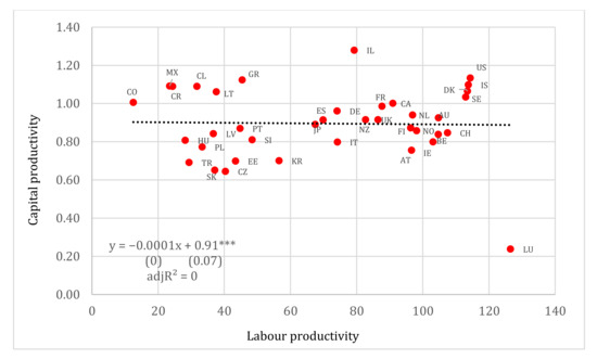 What is interesting to note is that with the exception of Luxemburg, Israel and Colombia, the dispersion in terms of capital productivity is much lower as compared to the dispersion of labour productivity among OECD countries. Excluding the outliers mentioned above, the distance between the top and the lowest country in terms of capital productivity is 74%, while that of labour productivity is 395%, respectively. This implies that the discrepancy in terms of productive efficiency, as reflected in the productivity of capital, is much narrower than labour productivity differentials. Productive efficiency can be considered as the proses of maximizing the production level of a given quantity of inputs used to produce this product [26,27,28], thus in terms of our analytic framework it corresponds to (see, for example [29]). For an empirical verification of the relation between capital productivity and productive efficiency, see [14].