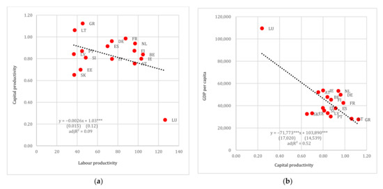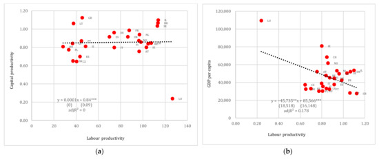 (a) Labour productivity vs. capital productivity and (b) capital productivity vs. GDP per capita (in USD pps), Eurozone. Note: Standard errors reported in parentheses. *** denotes 1% levels of statistical significance.