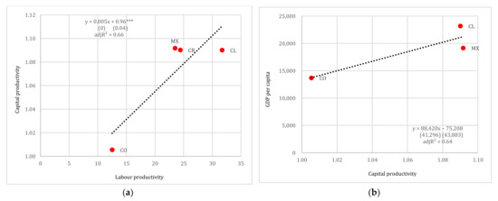 (a) Labour productivity vs. capital productivity and (b) capital productivity vs. GDP per capita (in USD pps), Latin America. Note: Standard errors reported in parentheses. *** denotes 1% levels of statistical significance.