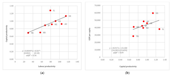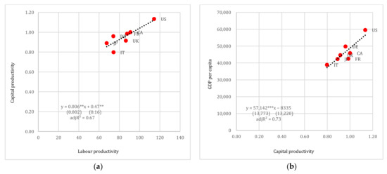 (a) Labour productivity vs. capital productivity and (b) capital productivity vs. GDP per capita (in USD pps), G7. Note: Standard errors reported in parentheses. **, *** denote 5% and 1% levels of statistical significance, respectively.