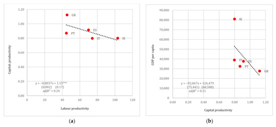 (a) Labour productivity vs. capital productivity and (b) capital productivity vs. GDP per capita (in USD pps), PIIGS. Note: Standard errors reported in parentheses. *** denotes 1% levels of statistical significance.