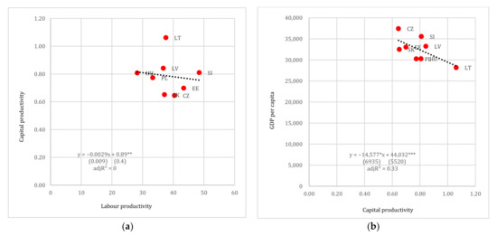 (a) Labour productivity vs. capital productivity and (b) capital productivity vs. GDP per capita (in USD pps), post-Soviet. Note: Standard errors reported in parentheses. *, **, *** denote 10%, 5% and 1% levels of statistical significance, respectively.