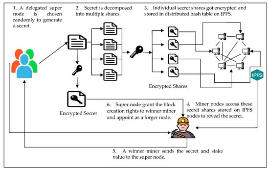 Shamir’s secret sharing method, PoS with randomized selection, and IPFS are all used in the proposed approach. This hybrid algorithm is divided into two steps. Initially, a delegated super node will be chosen at random to produce a secret and breakdown a secret into n separate shares. After encryption, these secret shares will be kept on the IPFS network. The miner nodes will compete to gain access to secret shareholders to divulge the secret. To discover the exact secret, a minimum of k shareholders must be accessible. The miner who successfully regenerates the secret is referred to as the forger node. The secret will then be sent to the delegated super node together with the staked reputation coins by the forger node. Upon verification of the correct secret, block generation rights are granted to that forger. In the following stage, PoS with randomization will be used to calculate the correct hash value by the using secret value that was just disclosed. Hash functions are appropriate for usage in several applications, including blockchain due to their lack of collision and ease of computation [33]. The forger and delegated super node will receive rewards in an 80-20 ratio for each valid block. A malicious forger node will lose all of its reputation coins and will be either prohibited from mining or removed from the network. This technique will aid in the prevention of various malicious attempts.