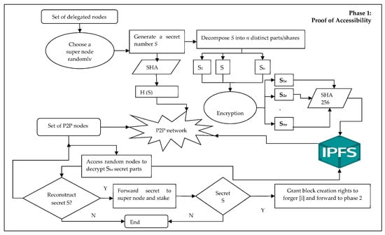Though many consensus algorithms exist in the literature, they all come with various shortcomings such as efficiency, energy consumption, and privacy concerns. We propose a new consensus algorithm, Delegated Proof of Accessibility, based on secret sharing and proof of stake with randomized selection. The algorithm is divided into two phases: (a) Proof of Accessibility and (b) PoS using randomized selection, as shown in Figure 4 and Figure 5, respectively.