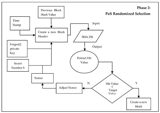- Block Creation and Verification: Once a node has proved that it has accessed all the shareholders and revealed the correct secret generated by the super node, it will be assigned to create the block creation rights; we named this node forger node. A forger uses its secret key to calculate an encrypted value from the hash of its predecessor block. The hash of this encrypted value is then calculated, and the first 64 bits of the resultant hash value are termed as “hit value”. The inclusion of the secret key in the above computation ensures that a unique hit value is derived exclusively from a forger. For the forging, a node producing a hit value less than that of the “target value” is selected [2]. The target value is obtained by using (3).where = “base target value” = previous block target value × time consumed to forging that block, L = time elapsed since the last block forged, and = amount of reputation coins accumulated or staked [2].Once a block has been created, it is disseminated to other P2P nodes for verification. The block will be stored on the blockchain if more than half of the network nodes have verified it.
