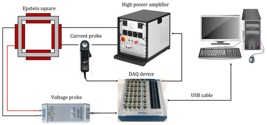 The primary winding is fed by a linear, 4-quadrant, programmable power amplifier (PA 100-52—Brockhaus Messtechnik GmbH & Co. KG, Lüdenscheid, Germany) with a maximum output power of 5.0 kW, optimized for resistive–inductive loads. The power amplifier is driven by a data generation/acquisition module (NI® USB 6363-BNC Type) via an analog output port, programmed via PC using the session-based interface available in Matlab® (version 2021b—The MathWorks, Inc., Natick, CA, USA). The current on the primary coil is detected through a DC—100 MHz active current probe (RT-ZC02—Rohde & Schwarz GmbH & Co. KG). Finally, the electromotive force at the secondary coil is measured using a DC—100 MHz active voltage probe (DP 10013—Shenzhen Micsig Technology Co., Ltd., Shenzhen, China) to increase the signal-to-noise ratio. The current and the voltage probes are connected to opportunely configured analog inputs of the data acquisition/generation module. A scheme of the experimental setup used to measure the dynamic hysteresis loops is shown in Figure 1.