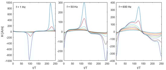 A family of eight magnetization loops with amplitude = 0.2, 0.4, 0.6, 0.8, 1.0, 1.2, 1.4, and 1.5 T was measured at each one of the frequencies = 1, 2, 5, 10, 20, 50, 100, 200, 300, 400, 500, and 600 Hz. A sample rate equal to 250/f was chosen, such that all the hysteresis loops were sampled with the same number of samples per period. In the figure below, the magnetic-field waveforms obtained to acquire the sinusoidal inductions at any amplitude between 0.2 and 1.5 T are shown for f = 1, 50 and 600 Hz.